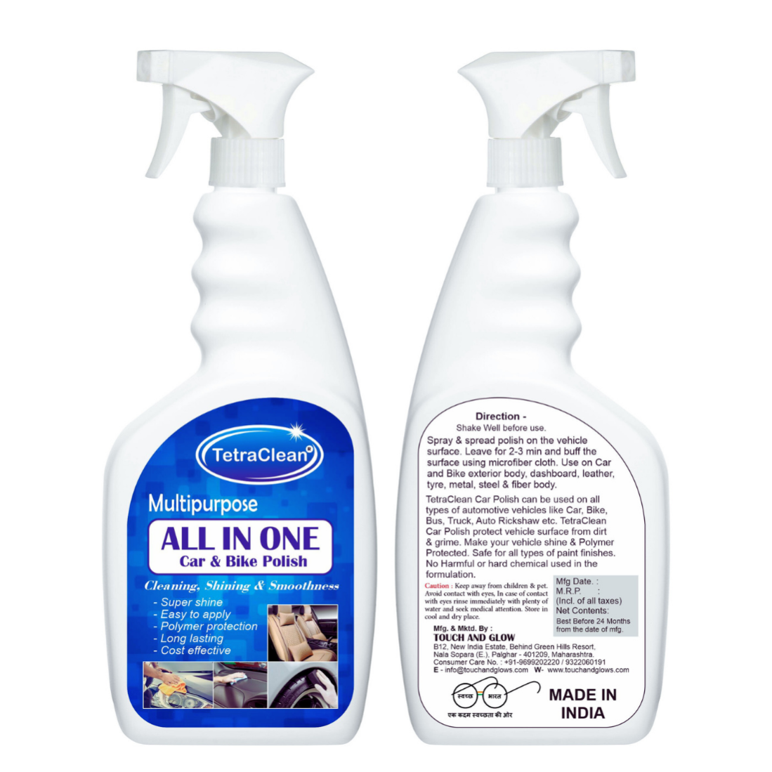 TetraClean All-in-One Car & Bike Polish delivers super shine, smoothness, and long-lasting protection. Safe for paint, metal, leather, tires, and dashboards—just spray, wait, and buff for a showroom finish.