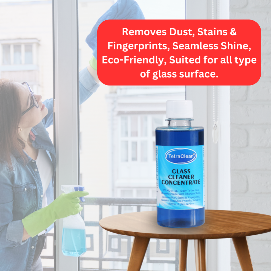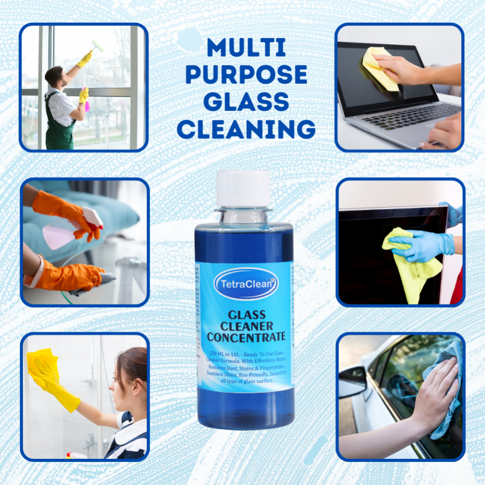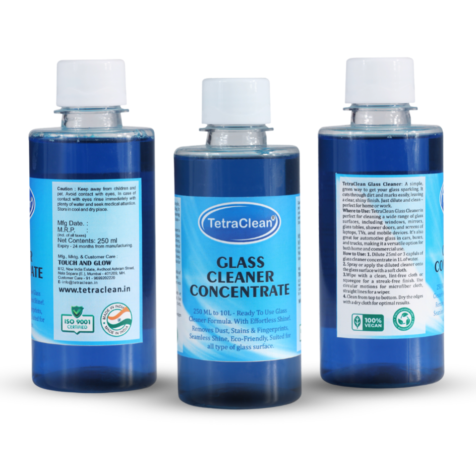 TetraClean Ultra Shine Glass Cleaner is a premium, high-performance formula designed for effortless cleaning of all types of glass surfaces. It effectively removes dirt, fingerprints, smudges, hard stains, and dust while killing 99.9% germs. The fast-drying, streak-free formula ensures crystal-clear shine with every swipe.