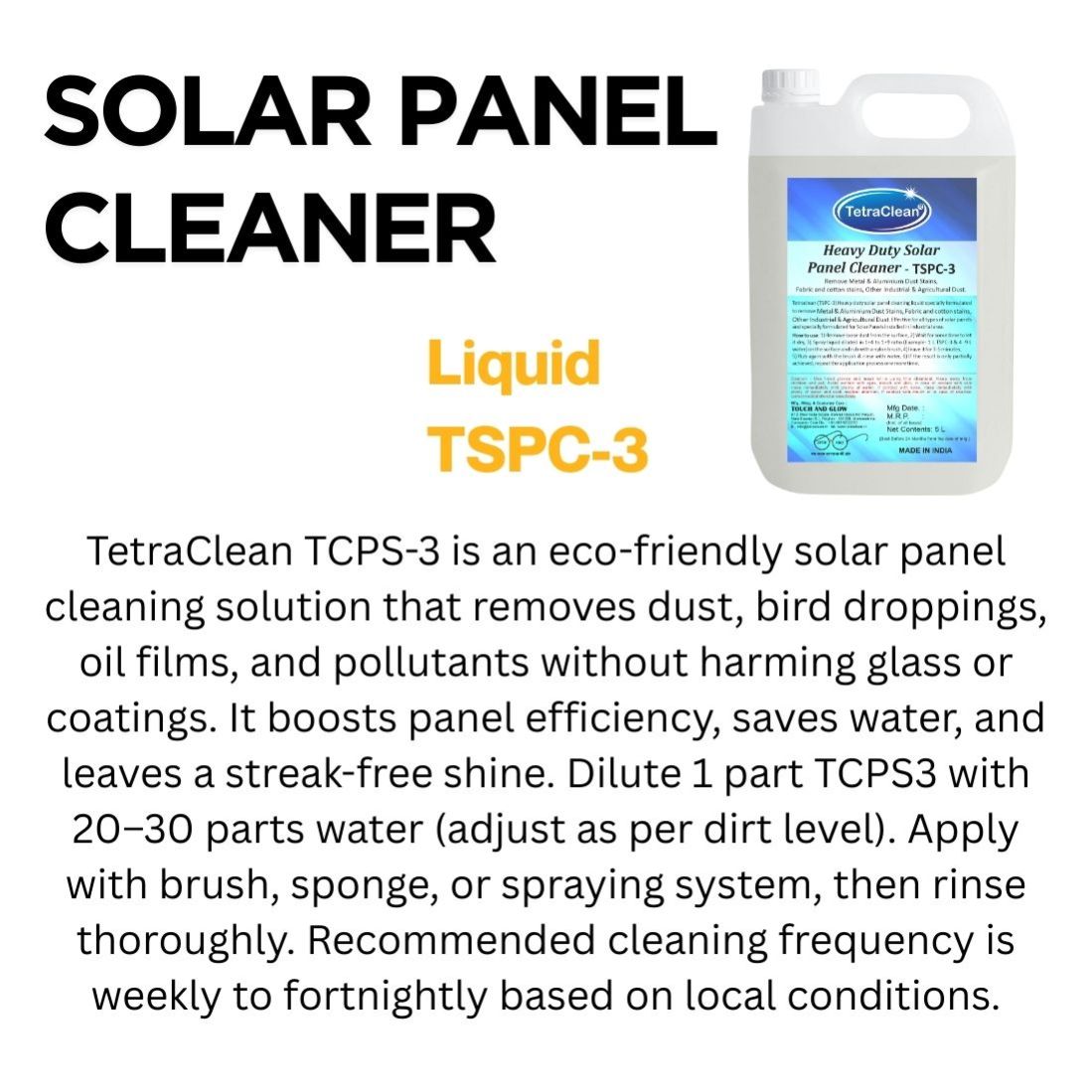 TetraClean Heavy Duty Solar Panel Cleaner TSPC-3 is a powerful cleaning liquid developed for effective maintenance of solar panels in tough environments. It efficiently removes heavy cement dust, lime dust, hard water stains, bird droppings, chimney dust, and other persistent industrial and natural dust